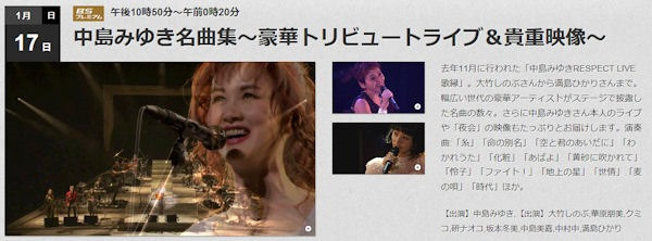 20200905NHKBSプレミアム「中島みゆき名曲集~豪華トリビュートライブ&貴重映像~」再22:30-24:00(90分)